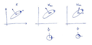 공분산 행렬 C는.. eigenvector 하나를 1 column으로 갖는 행렬 E와 eigenvalue를 dialgonal에 갖는 D로 표현하다면 C = E * D * E^T. 일반적으로 말하는 PCA는 Wpca = D^(-1/2) * E^T 이다. W=RWpca 에서 R 이 othogonal을 보장한다면 W 또한 Whitening Transformation이 된다. 그리하여 Wzca = E * Wpca = E * D^(-1/2) * E^T 즉, C^(-1/2) 가 된다.